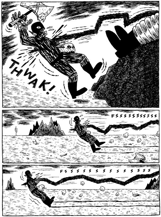 Vista con la mirada adecuada, incluso Johnny Ryan parece estar practicando slapstick –aunque sea violento– más o menos mudo en abundantes páginas de Pudridero, que no se caracteriza precisamente por las grandes parrafadas sino justamente por la acción de trompazos. Al fin y al cabo, es lo que Ryan ya hacía en sus cómics previos, aunque allí, sí, con una intención humorística directa. Hay, en fin, una amplia tradición de acción en el cómic, no hace falta insistir más, basta pensar también en los superhéroes desde los años treinta, que derivaban en buena parte de las primeras tiras de prensa de aventuras, y tal vez por eso la acción nos parezca a veces tan “natural” (ninguna tradición lo es, por supuesto; la tradición lo que hace es naturalizar la invención, el artificio, la convención) para el lenguaje del cómic. Casi como si los tebeos fueran exclusivamente born for action. Tal vez por esa amplia tradición, un cómic (una novela gráfica) de acción tan bruta como Pudridero esté siendo tan fácilmente asimilado y celebrado por sus lectores. A pesar de que es, como probablemente diría su autor en román paladino, rara de cojones.