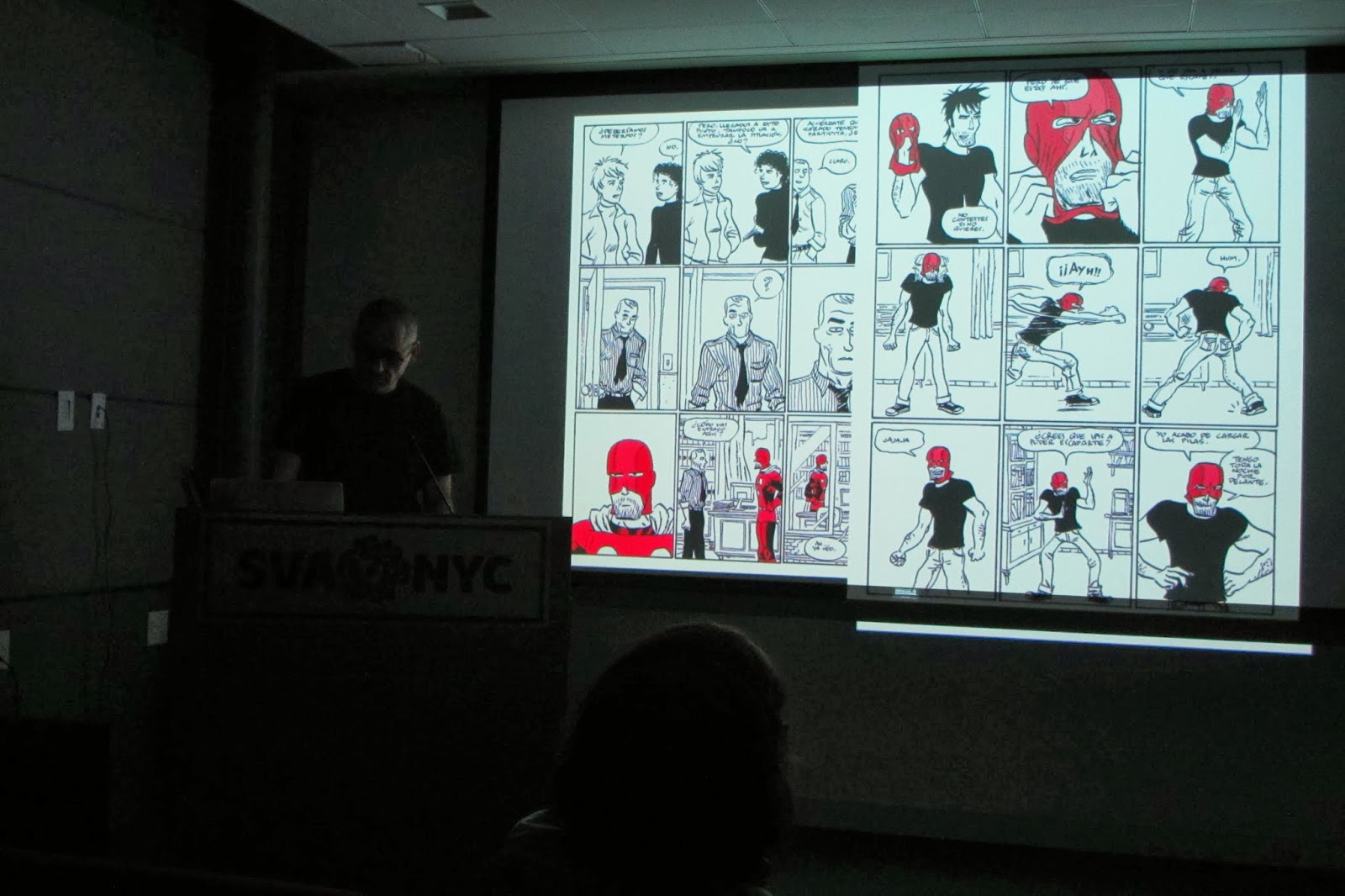 Para continuar, el 12 de septiembre di una charla en la School of Visual Arts, una conferencia que les había prometido también en mi propuesta como visiting scholar, y que titulé Lose Yourself to Story: Tribulations of a Spanish Cartoonist. 45 minutos en los que usé como hilo narrativo conductor el pasado, presente y futuro de mi carrera como dibujante, pensando sobre todo en el tipo de cuestiones que les interesa a los estudiantes de una escuela artística. Desde mis primeras publicaciones en la segunda mitad de los noventa, tanto ilustraciones como tebeos –mi debut profesional en el cómic dentro del sello Laberinto de Planeta DeAgostini, dirigido por Toni Guiral–, con todas las dudas habituales del comienzo, sobre el camino a seguir y los temas personales, a los diversos hallazgos creativos que he ido encontrando en ese camino, a menudo por sorpresa. En este sentido intenté explicar algunas conclusiones sobre el lenguaje del cómic y del dibujo a las que he llegado, siquiera provisionalmente, lo largo de esa trayectoria. Colaborar con otros autores, por cierto –en mi caso es bien conocida mi larga colaboración con Santiago García– te enriquece y te permite llegar a lugares a los que por ti solo jamás habrías llegado. También les hablé abiertamente de las influencias en ese trabajo. Gestionar la «ansiedad de las influencias» pasa sobre todo, a mi juicio, por reconocerlas sin complejos y rendirles homenaje. En la última parte de la charla señalé algunas claves sobre mi trabajo como ilustrador –la ilustración y las artes gráficas en general tienen un gran peso en los estudios de la School of Visual Arts, particularmente en el Máster en Narración visual a cuyo programa estuve adscrito– y también les hablé de los libros que tengo entre manos ahora mismo: entre ellos El vecino 4, de nuevo junto a Santiago García, el libro de mi tesis sobre Frank Miller y uno en solitario que se titulará La crisis según/Los 15 mandamientos, un proyecto hecho realidad gracias al empeño de su editora, Isabel Cortés. Para cerrar el acto, las imprescindibles preguntas del público –un par de ellas giraron en torno a las herramientas y métodos de trabajo, al hilo de mis explicaciones previas– y un breve rato para enseñar la carpeta de originales, que me pidieron porque a los estudiantes les gustar verlos. En mi caso, las páginas que había dibujado estando en NYC. The city that never sleeps.